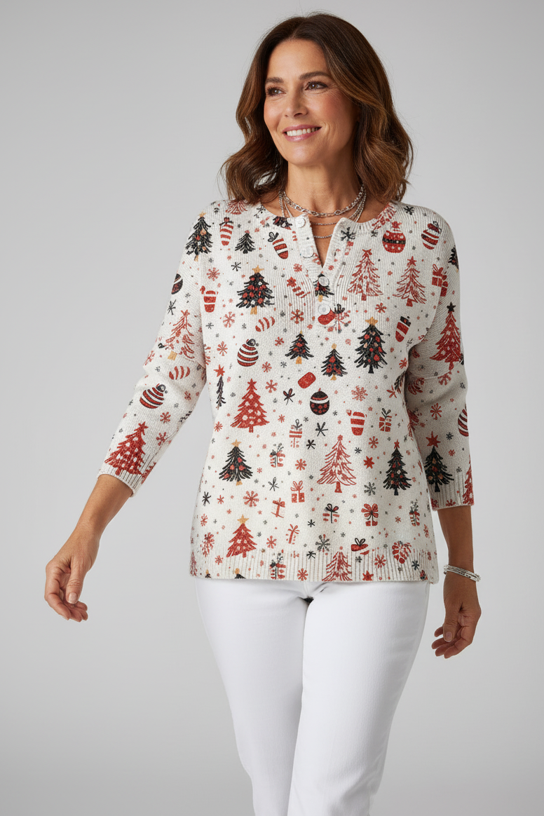 El suéter navideño Paloma está diseñado para aportar calidez, alegría y un toque de elegancia a tu vestuario festivo. Con delicados detalles de botones y una suave textura de punto, combina la acogedora sensación del invierno con una silueta femenina y refinada.